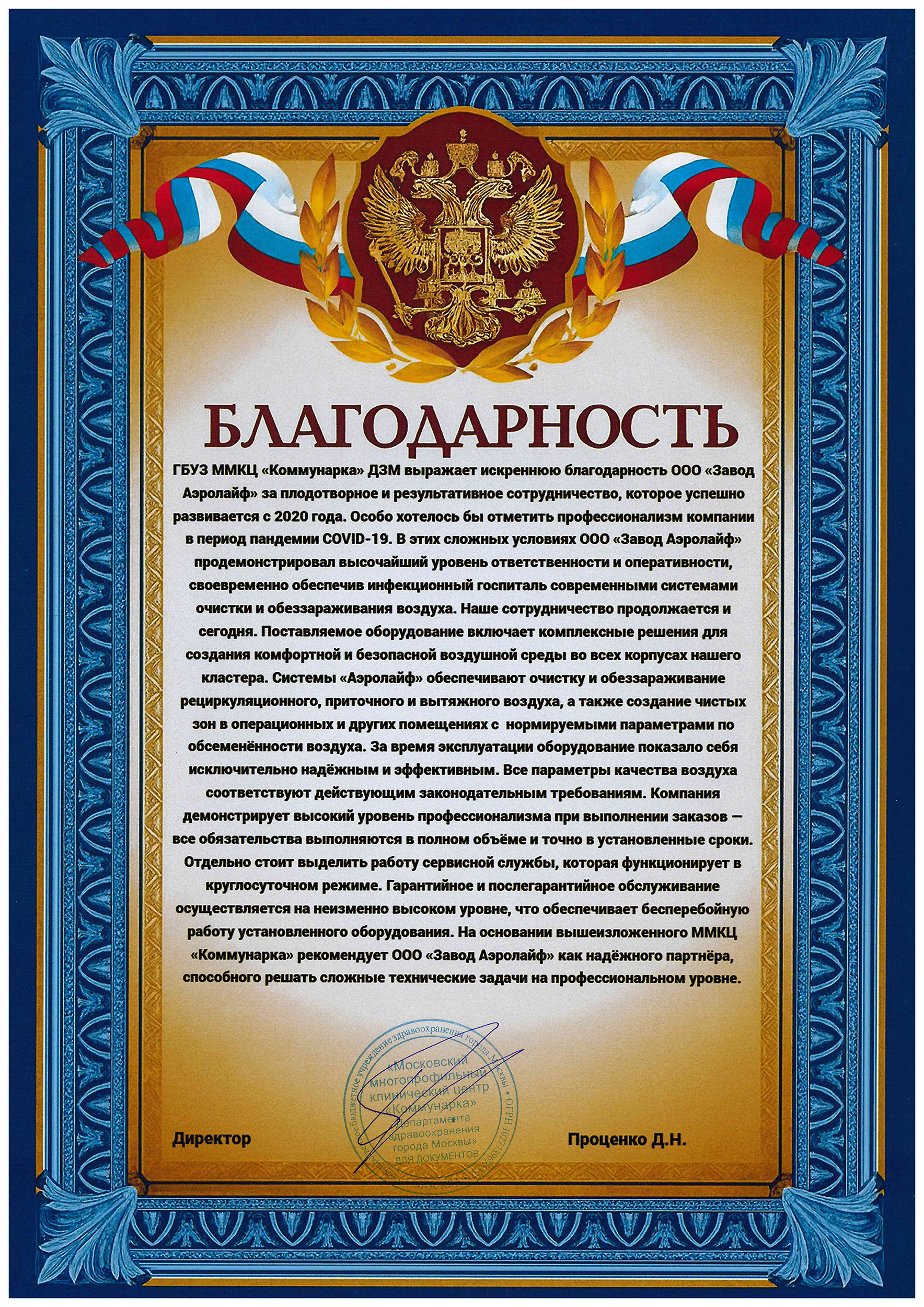 Компания «Аэролайф» удостоена благодарственного письма от Дениса Николаевича Проценко — директора ГБУЗ «ММКЦ „Коммунарка“ ДЗМ».
